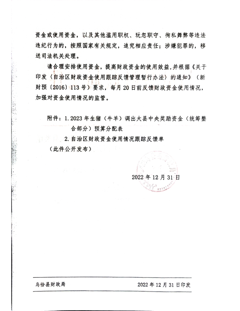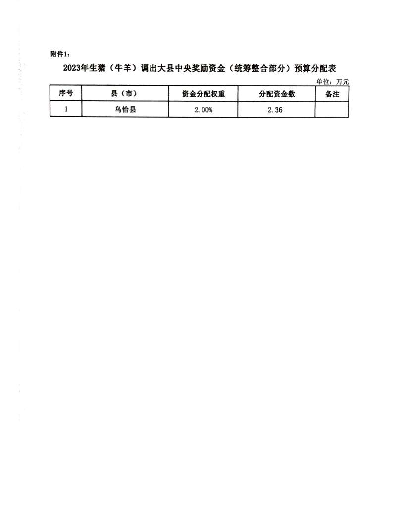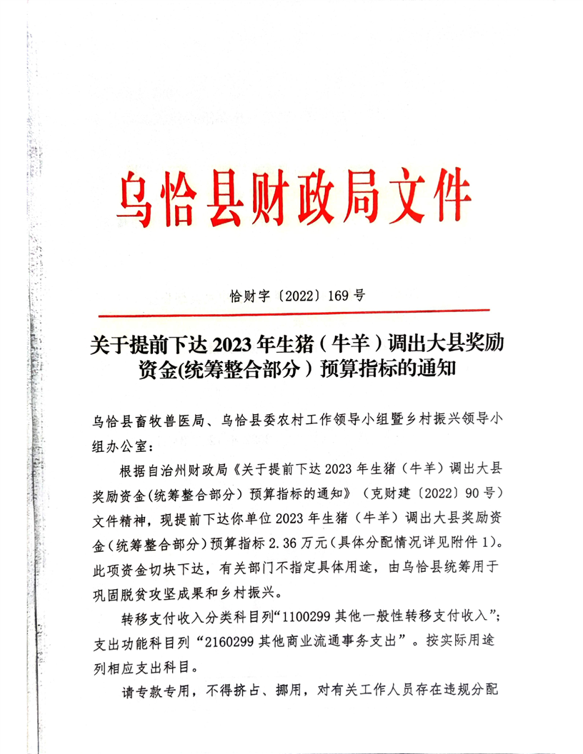 关于提前下达2023年生猪(牛羊)调出大县奖励资金(统筹整合部分)预算指标的通知