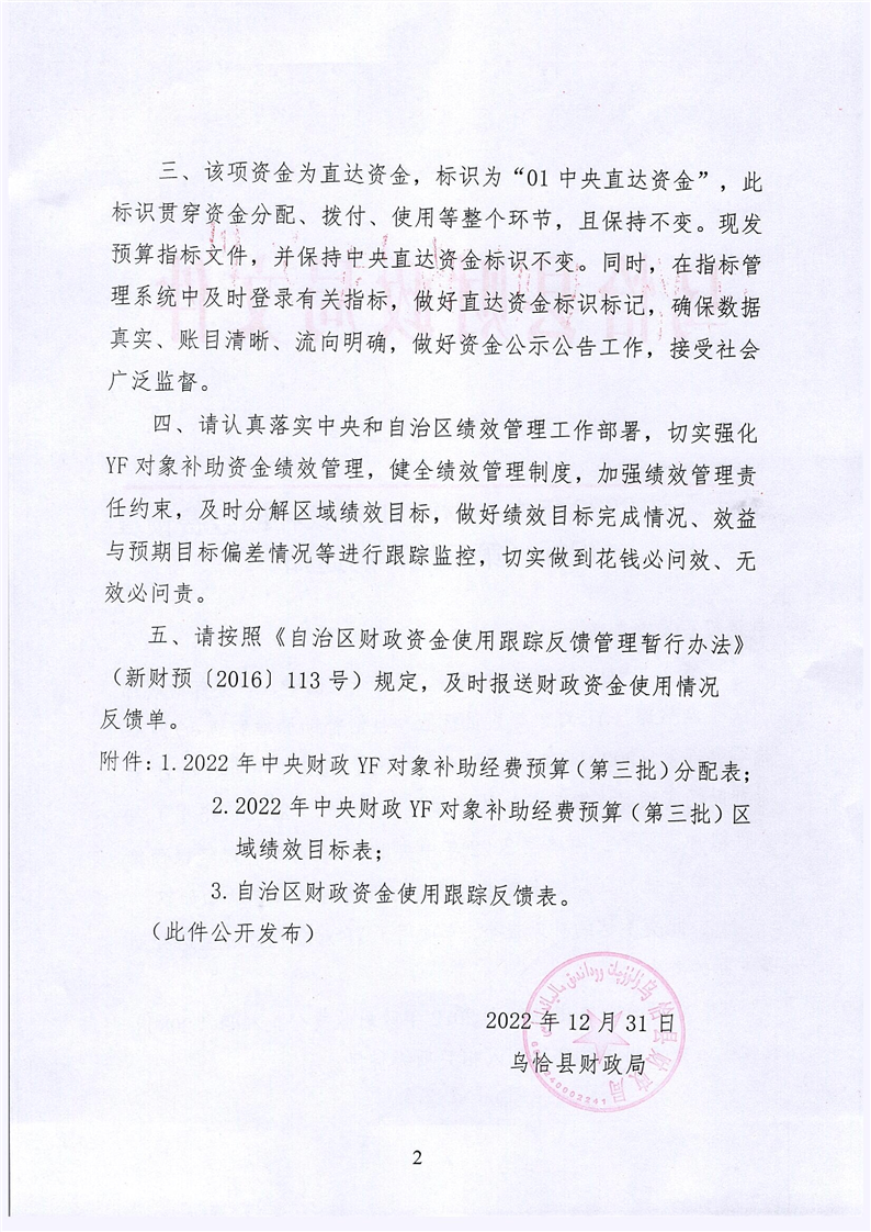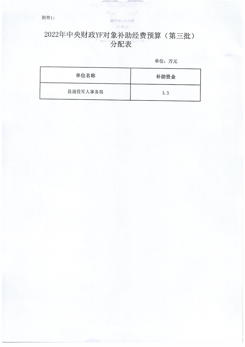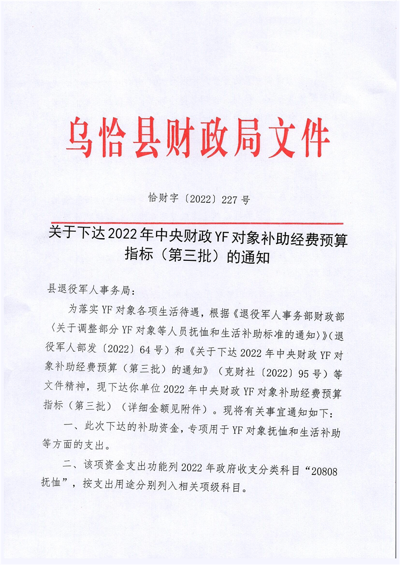 关于下达2022年中央财政YF对象补助经费预算指标(第三批)的通知