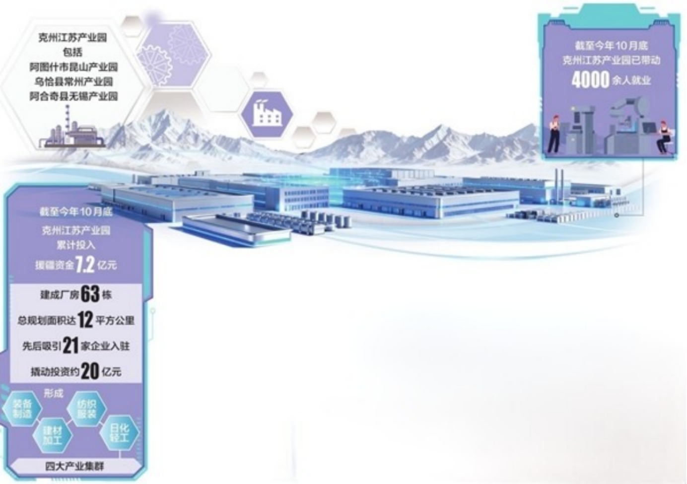截至今年10月底,克州江苏产业园累计投入援疆资金7.2亿元,先后吸引21家企业入驻,撬动投资约20亿元,建成厂房63栋,总规划面积达12平方公里,成为克州工业经济的核心引擎。