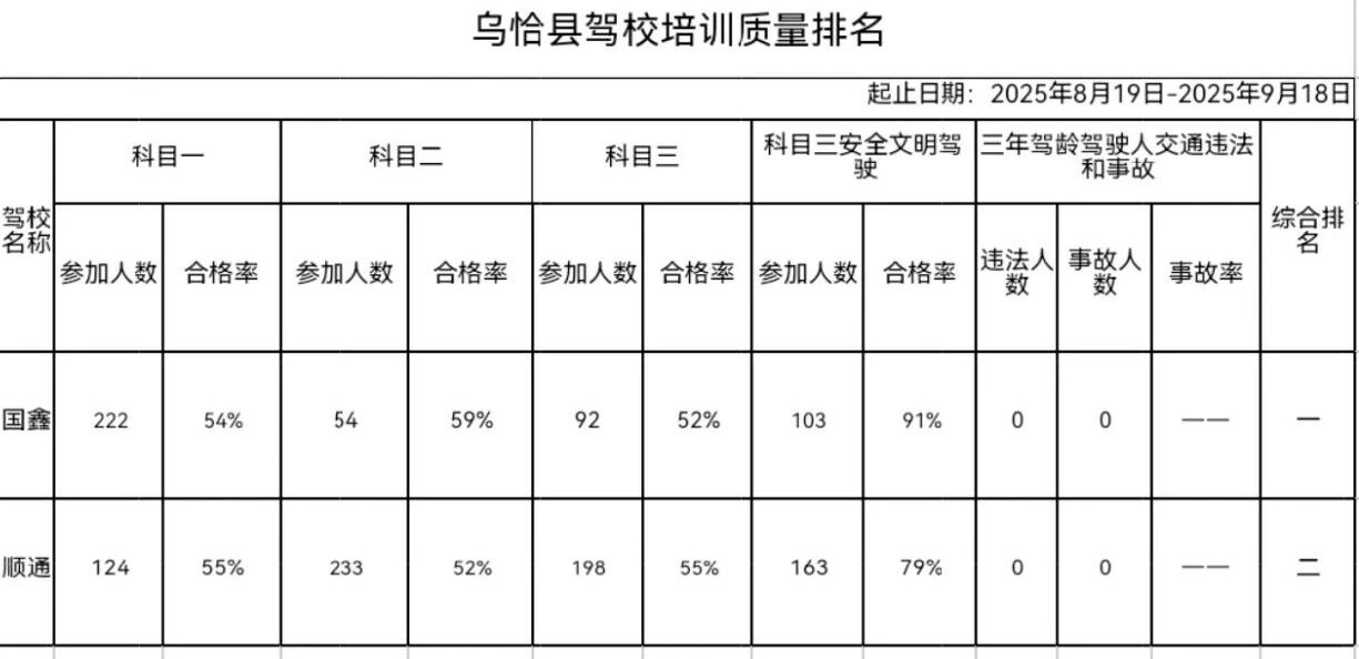 乌恰县驾培机构2025年9月份培训质量排名公示