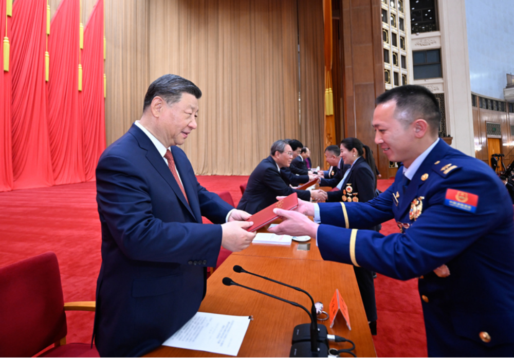 4月28日,庆祝中华全国总工会成立100周年暨全国劳动模范和先进工作者表彰大会在北京人民大会堂隆重举行。这是习近平等党和国家领导人为全国劳动模范和先进工作者代表颁发荣誉证书。新华社记者 谢环驰 摄