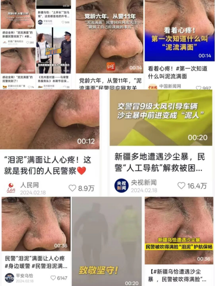 “我曾经见过‘泪流满面’,今天见识了‘泥流满面’”“谁说站在光里的才算英雄?站在沙尘暴里的也是!”……2024年2月,一段民警在强沙尘暴中逆风前行、为过往车辆护航的视频刷屏全网。视频迅速登上央视新闻、人民网等权威媒体,微博热度突破1500万,4天内被235家中央及地方媒体转发,全网相关话题量飙升至5000万+。
