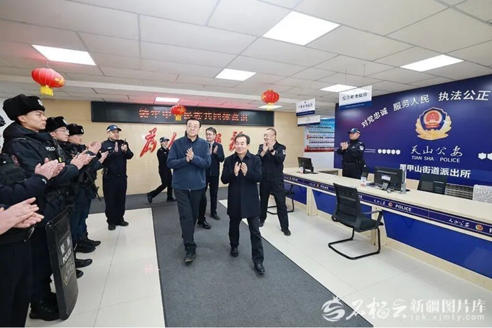 2月20日,自治区党委书记陈小江在乌鲁木齐市天山区黑甲山街道派出所,看望慰问执勤民警、辅警,详细了解节日巡防、警情处置、便民服务等工作开展情况。石榴云/新疆日报记者 崔志坚 摄