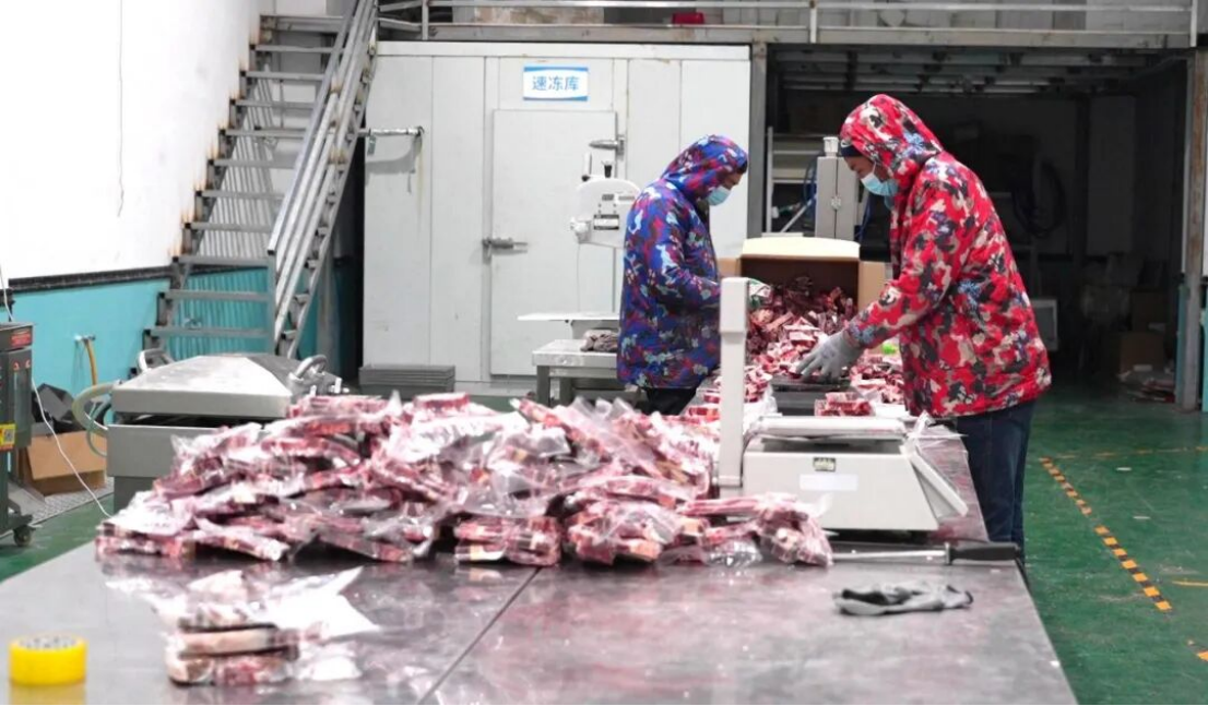 在乌恰县葱岭牧人食品贸易有限公司车间内,流水线高速运转,工人们身着工装,有条不紊地进行羊肉分拣、打包、封装,呈现出一派繁忙的生产景象。