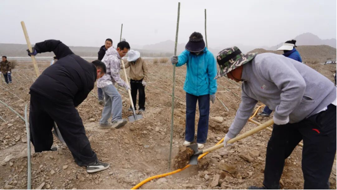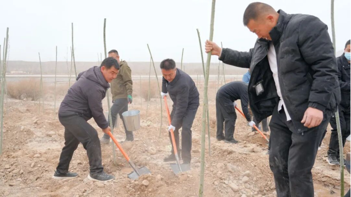 植树现场,党旗飘扬,人声鼎沸,呈现出一派热火朝天的劳动景象。县领导与干部群众并肩劳作,大家三五成组、分工协作,挥锹铲土、扶苗正杆、填土压实、提水浇灌,每一个环节都认真细致、有条不紊。经过一天的辛勤劳作,数千株新栽种的树苗整齐排列、迎风挺立,为初春的乌恰大地勾勒出盎然生机。