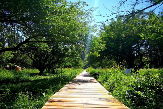 “百杏生态园”是依托坎久干村杏园内上百棵树龄近百年的古杏树和依山而立的高原自然生态风光,结合当地经济社会发展情况和人文环境特征,富有柯尔克孜特色的集“赏、吃、住、行、游、购、娱”为一体的“百杏生态园”乡村旅游目的地。景区内八座毡房牧家乐充分展现了柯尔克孜族民俗和文化,从羊毛毡子到刺绣,再到里面陈设的柯尔克孜族服饰,整个毡房就像一座柯尔克孜族民俗文化展示馆。此外,园内还建成了扶贫创业中心——阳光生态餐饮中心、建设了停车场、婚礼广场、儿童游乐场和大型音乐喷泉,完善的服务吸引了大量游客到这里来举办婚宴、亲朋好友聚餐及各类户外活动。